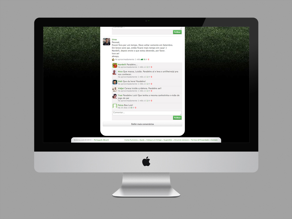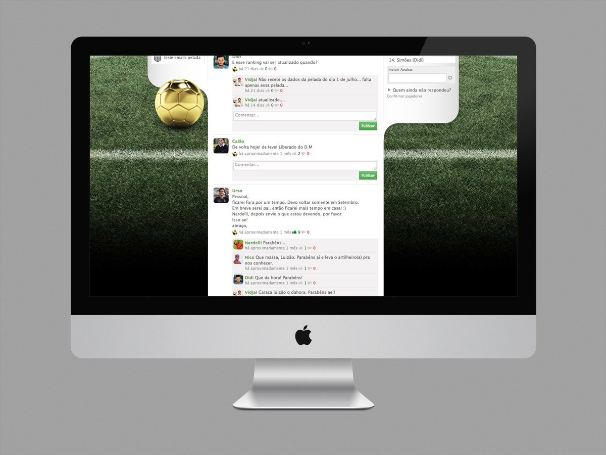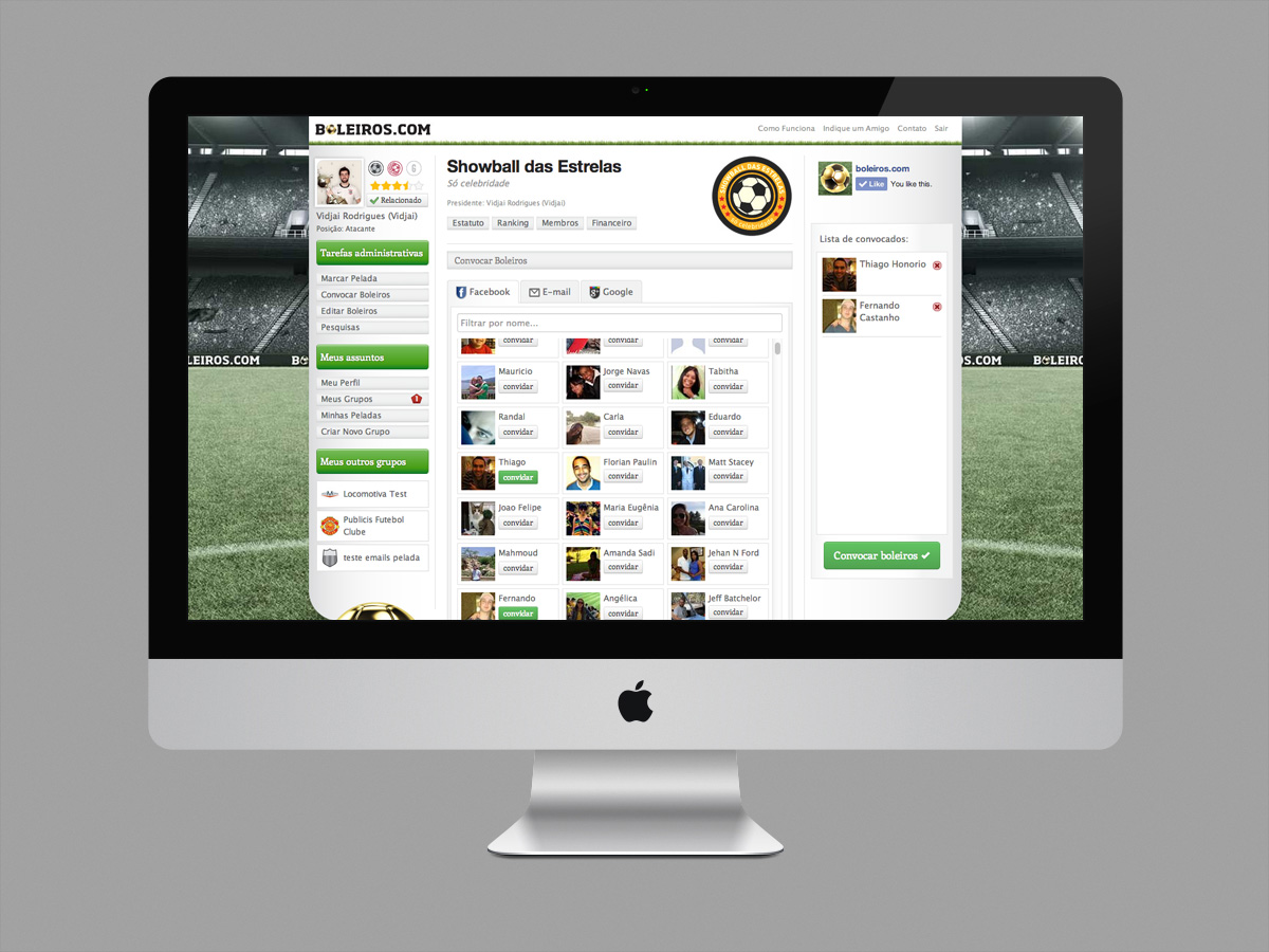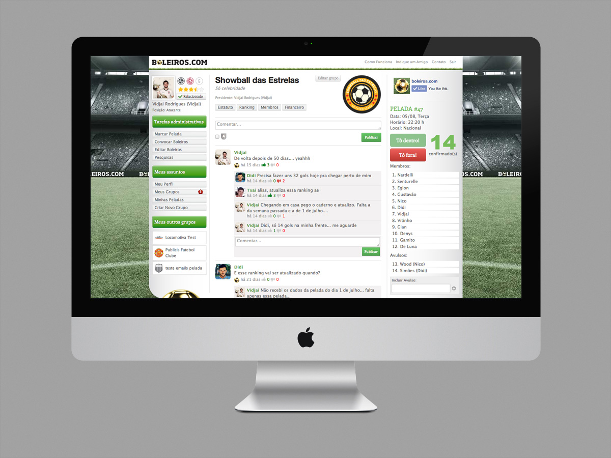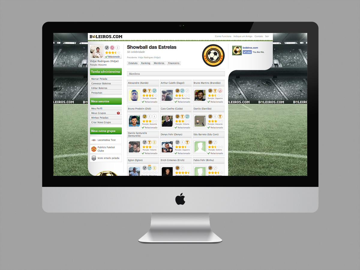 Desenvolvimento da plataforma social boleiros.com, um site que ajuda jogadores de futebol amador a organizar seus grupos, suas peladas e outros assuntos pertinentes às equipes. O projeto incluiu desenvolvimento de layouts, programação e acompanhamento nas redes sociais.
